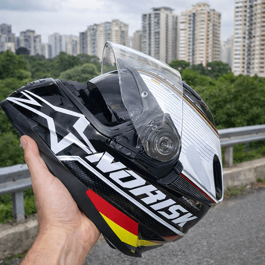 Capacete Norisk. Características: Aqui na NORISK, não seguimos o óbvio, criamos nosso próprio caminho. Então, quando dizemos que somos "descolados", é um compromisso com a mudança e a evolução constante. Estamos aqui para garantir a segurança dos nossos #noriskers. Bora fazer barulho no mundo motociclista #wemakenoise. Há muitos novos caminhos para percorrer com a sua moto e, naturalmente, você precisa de praticidade em suas aventuras. Por isso, a NORISK desenvolveu o Route, uma nova proposta "Feito para quem passa muito tempo com a moto" – Destaca o conforto e a leveza dos capacetes Norisk, ideais para longas jornadas.